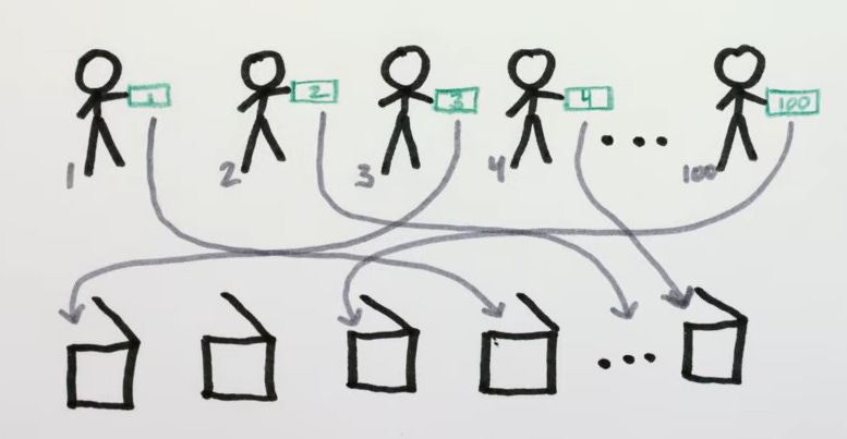 يوجد 100 سجين، وكل منهم يملك رقمًا من 1 إلى 100 ، أخبرهم الحارس أن هنالك غرفة مليئة بالصناديق إذ أن هنالك 100 صندوق يطابق عددهم تماماً.